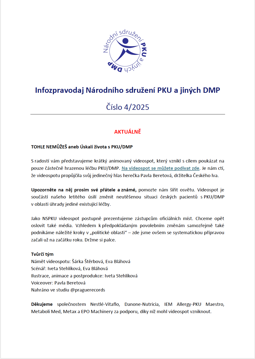 Infozpravodaj NS PKU je elektronický newsletter sdružení s nepravidelnou periodicitou. Přináší souhrn důležitých novinek, zprávy o tom, co právě řešíme, co připravujeme, na jaké akce se můžete těšit či co je nového v našich metabolických centrech.